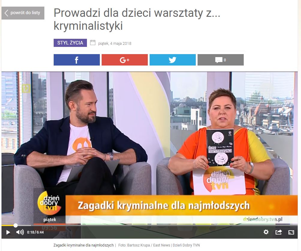 Dr Joanna Stojer-Polańska gościła w telewizyjnym programie „Dzień Dobry TVN”. Z pasją opowiadała o swojej pracy oraz o swoim nowym dziele – pozycji kryminalistycznej dla dzieci. Wyjaśniała, dlaczego to takie ważne, by dzieci miały świadomość konieczności zachowań bezpiecznych oraz tego, ze każda działalność zostawia ślad…