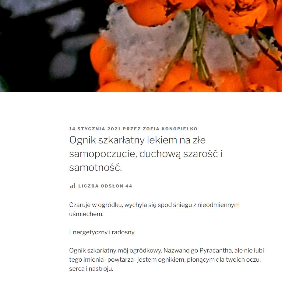 “Ognik szkarłatny mój ogródkowy. Nazwano go Pyracantha, ale nie lubi tego imienia- powtarza- jestem ognikiem, płonącym dla twoich oczu, serca i nastroju.