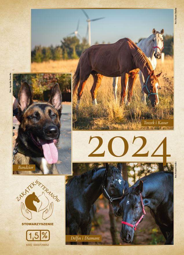 Kalendarz charytatywny na rok 2024 do pobrania, honorujący Stowarzyszenie Zakątek Weteranów dla wycofanych ze służby psów i koni służbowych.