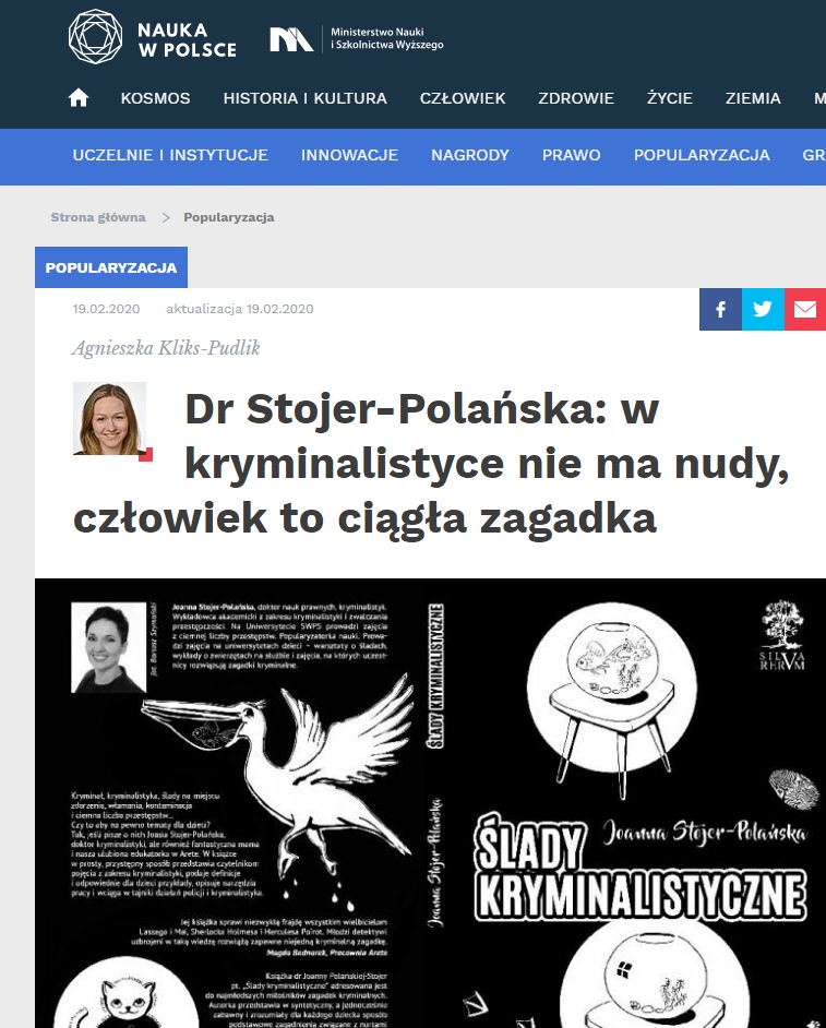 “Kryminalistyk nigdy się nie nudzi, ponieważ człowiek to ciągła zagadka i wciąż wymyśla nowe sposoby na popełnienie przestępstwa i zatarcie śladów – tłumaczy swą fascynację poszukiwaniem śladów kryminalistycznych dr Joanna Stojer-Polańska” – pisze redaktor Agnieszka Kliks-Pudlik na portalu naukawpolsce.pl.