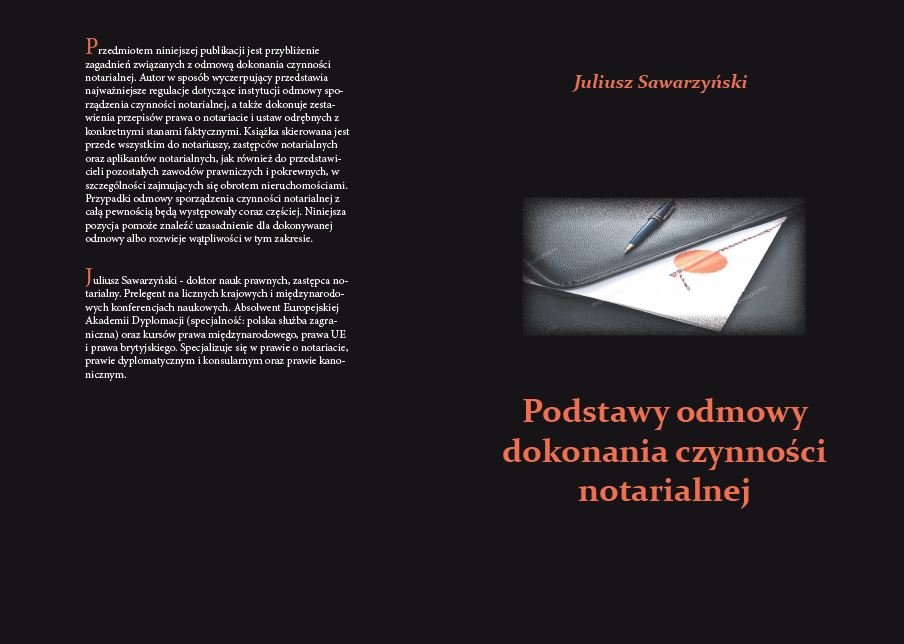 Niebawem ukaże się kolejna specjalistyczna pozycja z zakresu prawa notarialnego. Autor, dr Juliusz Sawarzyński, szczegółowo omówił w swojej publikacji podstawy odmowy dokonania czynności notarialnej.