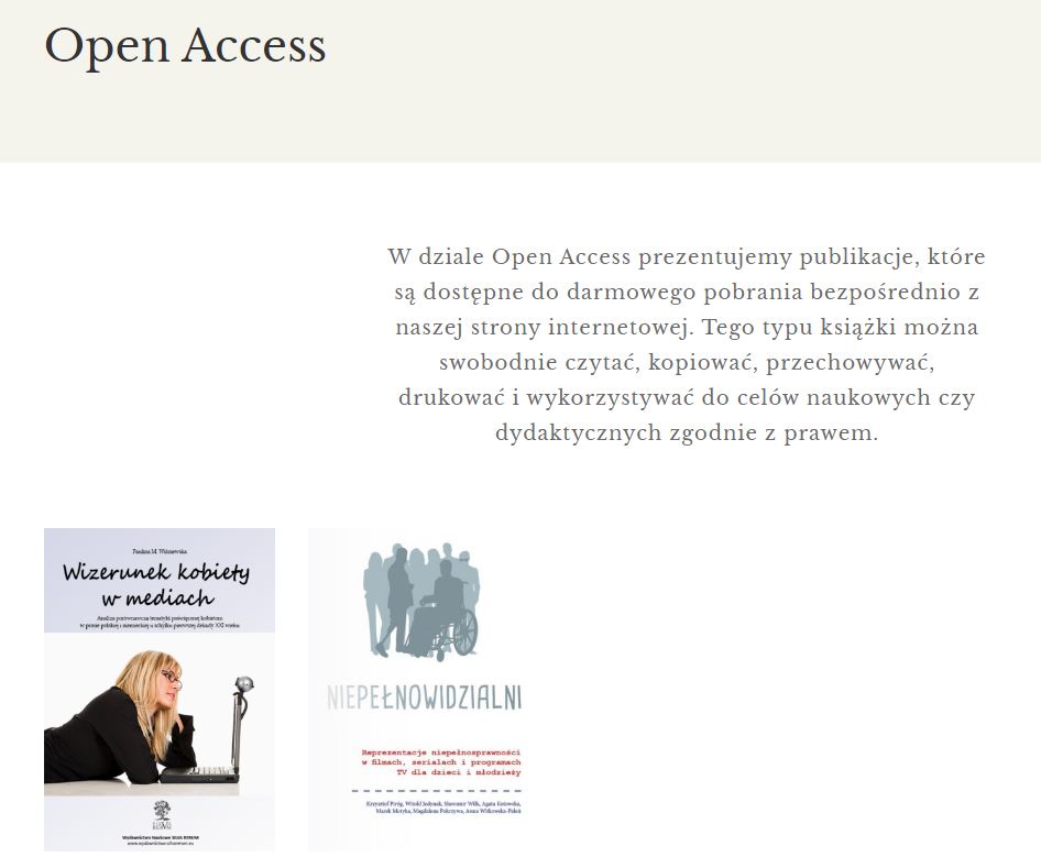 Kliknij do zakładki – Księgarnia – Open Access i korzystaj z dorobku naukowego i badawczego udostępnionego do darmowego pobrania i korzystania pod warunkiem przestrzegania praw autorskich.
