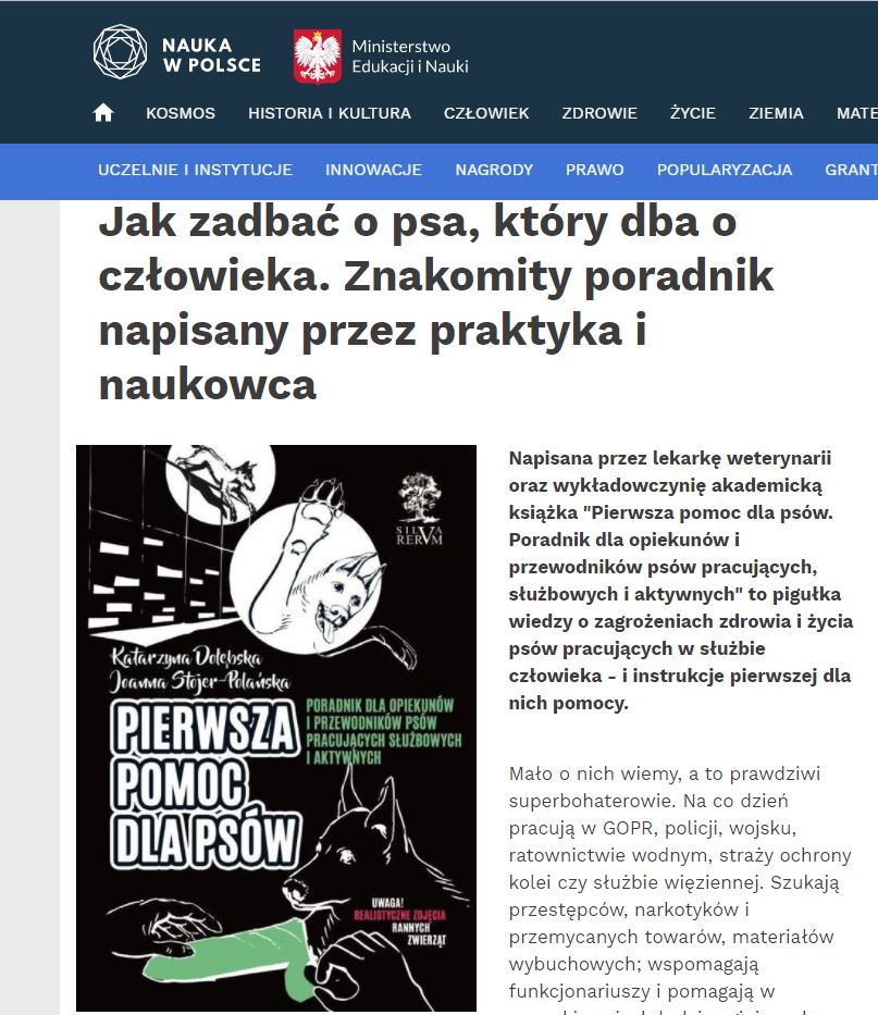 Oto je fragment: “Napisana przez lekarkę weterynarii oraz wykładowczynię akademicką książka “Pierwsza pomoc dla psów. Poradnik dla opiekunów i przewodników psów pracujących, służbowych i aktywnych” to pigułka wiedzy o zagrożeniach zdrowia i życia psów pracujących w służbie człowieka – i instrukcje pierwszej dla nich pomocy.