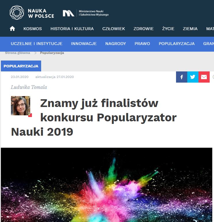 “Już wiemy, kto znalazł się w finale konkursu Popularyzator Nauki 2019. Sylwetki 22 kandydatów nominowanych do nagrody przedstawimy w kolejnych tygodniach w portalu Nauka w Polsce. Zwycięzców 15. edycji konkursu poznamy w końcu lutego.