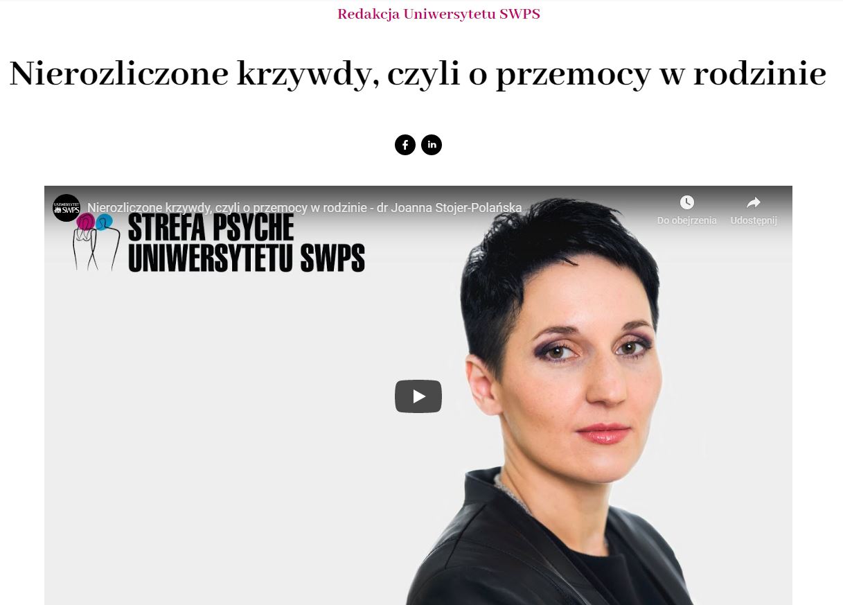 Ze strony www SWPS: Przemoc w rodzinie to zjawisko znane nie od dziś. Najczęściej jej ofiary milczą, a sprawcy mają poczucie bezkarności. Otoczenie nie chce się „mieszać w cudze sprawy”, zwłaszcza w przypadkach przemocy psychicznej, jeśli sprawca i ofiara się znają. Często brakuje reakcji na przemoc seksualną, kiedy sprawca i ofiara są w związku – takie przestępstwa najczęściej pozostają nieujawnione. Powinniśmy zauważać przemoc i reagować na nią. Pomaganie nie jest łatwe, ale nasza reakcja może być jedyną szansą dla ofiary. O zjawisku przemocy w rodzinie i o tym, jak wspierać osoby, które są krzywdzone przez najbliższych, opowiada kryminalistyk dr Joanna Stojer-Polańska – wykładowczyni kierunku Psychokryminalistyka na katowickim Uniwersytecie SWPS.