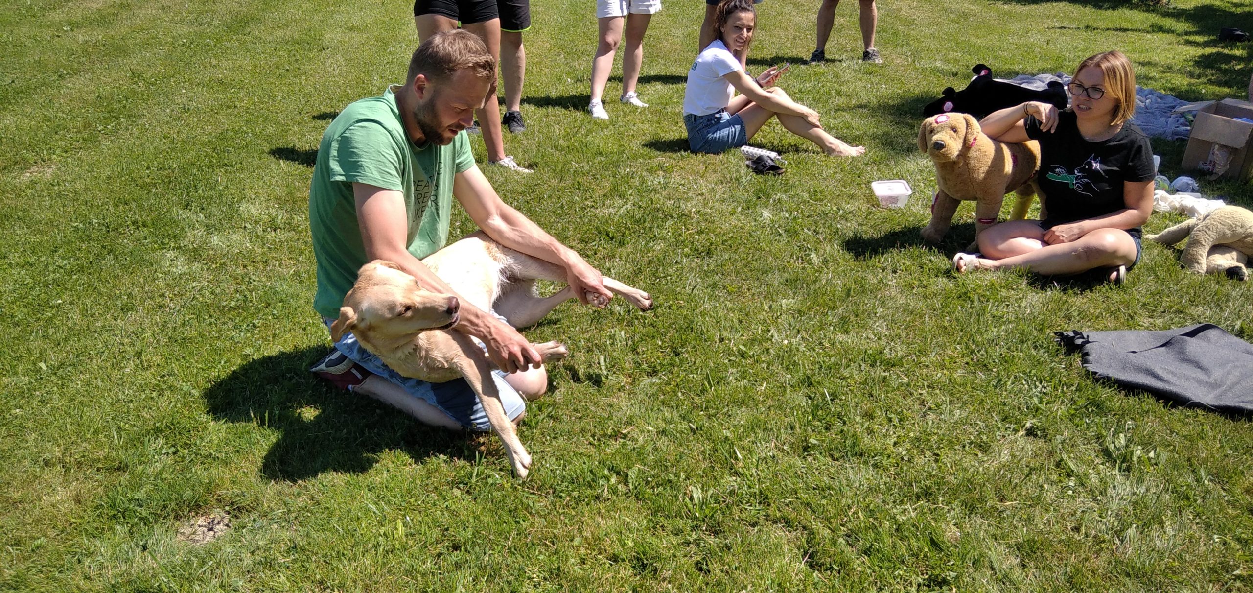 Pogoda słoneczna, a warsztaty praktyczne w terenie można było przeprowadzić dzięki wsparciu i wyrozumiałości ze strony psów uczestników zajęć. Oczywiście najwięcej zajęć w postaci bandażowania czy usztywniania łap wykonano jednak na psich manekinach.