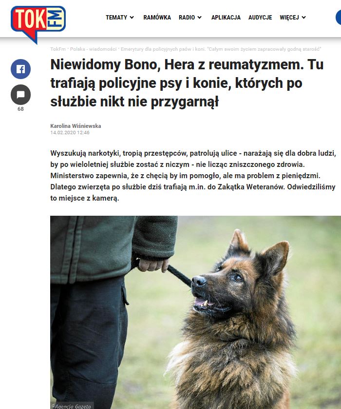 - TOK fm: “Wyszukują narkotyki, tropią przestępców, patrolują ulice – narażają się dla dobra ludzi, by po wieloletniej służbie zostać z niczym – nie licząc zniszczonego zdrowia. Ministerstwo zapewnia, że z chęcią by im pomogło, ale ma problem z pieniędzmi. Dlatego zwierzęta po służbie dziś trafiają m.in. do Zakątka Weteranów. Odwiedziliśmy to miejsce z kamerą.”