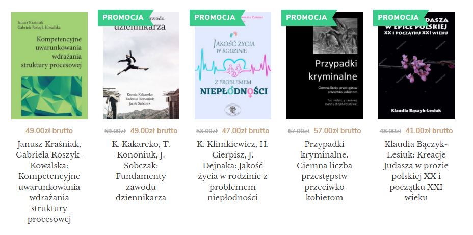 Z okazji nowego roku, czyli ostatniej dekady XXI wieku oferujemy styczniowy rabat specjalny – przy zakupie wybranej pozycji jedna książka dodatkowo gratis. UWAGA! Prosimy o wskazanie wybranego tytułu, w przeciwnym razie książka gratisowa nie zostanie dołączona.